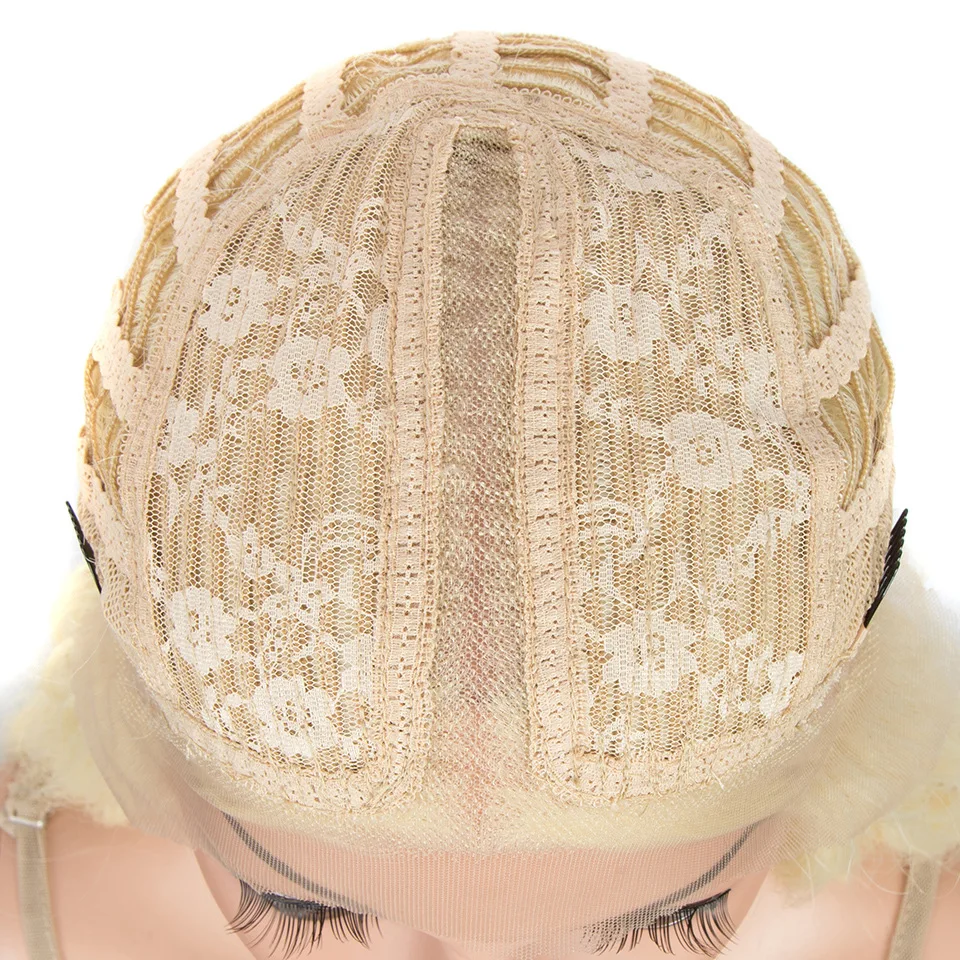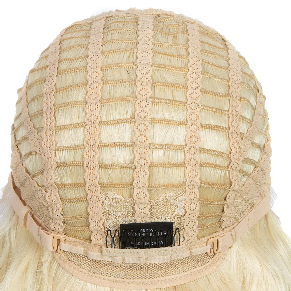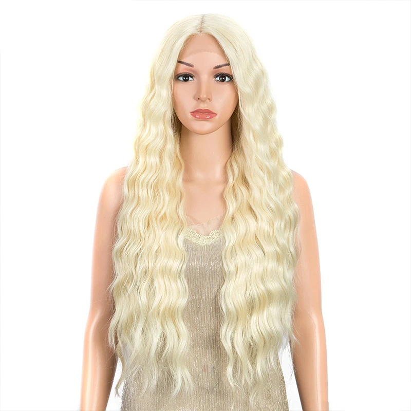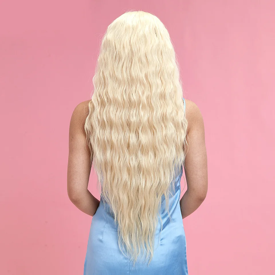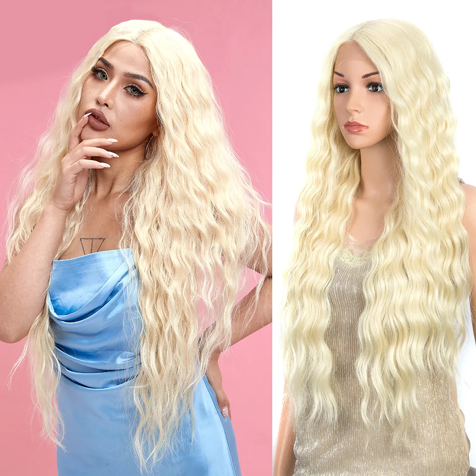 Premium 30-inch heat-resistant synthetic wig with blonde ombre color & natural wavy texture. Features lace front for realistic hairline. Perfect for daily wear & styling!